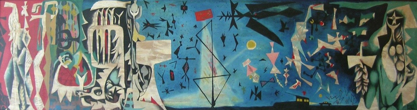 Regarding La Noche (The Night), 1950, we come across a work that can be considered great in many accounts, not only at a dimensional level but also because of its structural complexity, narrative, and because in this piece the artist seems to have successfully practiced and recombined several of his previous aesthetic, thematic, and stylistic discoveries with others that came before he decided to delve into abstract art. It is, without a doubt, an ambitious work, since its achievement required at least several studies or sketches before reaching its final version, which is currently housed by a private collection in Madrid (see image no. 12) [25]. Estudio de la Noche (The Study of the Night) ca. 1950 (image no. 12), a watercolour on cardboard measuring 45.7 x 207.6 cm, was recently procured by Chris von Christierson, the aforementioned South African collector and businessman. Despite its somewhat stuffy overall appearance, it is an appealing work, with a surreal and whimsical tone, divided in three big sections where intricate and severe forms are intertwined with wispy and poetic spaces, where the imaginary meets novel realistic elements such as a modern home and a new model American car, located in the lower right corner of the piece. One can sense, however, that the painting's undertone is overcome by a sense of the sacred, by a mystical and religious astonishment that comes face-to-face with darkness, an encounter with the mystery of the night. Although it might be confusing and imprecise, its aesthetic message is very clearly influenced by Afro-Cuban religion, as the religion’s philosophy is derived from nature, since Orichás and mpungos, unlike Western deities or Gods, represent essentially energies of nature. Beyond that direct evidence, or that supposition or guess, tangible evidence of Afro-Cuban symbols might be observed in the closed door located on the left side of the piece. The door is decorated with a tuft of palm plumes, similar to those placed at the entrance to the secret spaces where ceremonies of fambá for the temple of the Secret Society Abakuúa or of munanso (by practitioners of Palo Monte) or in the igdobu of Ocha and Ifá, take place. The object disappeared in the final version of the painting, as we can see in the image. But the desire to use the elements of Afro-Cuban culture is evidenced in the bag-shaped space coloured with the same pale red colour used in the central left part of the piece, where several crossed arrows form a triangle, much like in the erikuá style that is commonly used in the graphic language of Abakuá Anaforuana, and also in the signatures or symbolic traces used by the Palo Monte cult of Congolese origin. In the top part, images of constellations go from being simple linear diagrams drawn between one star and the other to become rare aerial beings, winged, with an ethereal appearance, presided over by a large black bird that immediately reminds us of the Cuban turkey vulture, known as gunugún to santeros and nsusu mayimbe to paleros, that the devout consider the messenger of Olofi and Nsambi Mpungo, respectively. The manifestation of an omnipresent deity is also represented (or imagined in a synchronous and synthetic way) by a bunch of imposing whitish characters that appear at the far right and perhaps at the extreme opposite; they’re not only witnesses of the night, they could possibly be the creators of that universe. But maybe we should not get ahead of ourselves because - as it’s usually the case with artistic expressions - these were perhaps unintentional decisions, products of intuition and not reason. At the core of Estudio de la Noche, as a halfway point between these two extremes, there is a sort of grand fallen star, half-buried, that seems to represent, judging by its shape, what will be his new abstract style, an outcome with less narrative but equally provocative. In the final version of the artwork, this figure is even more schematic and abstract, and it no longer resembles a fallen star, as we just suggested. The figurative gradually loses its predominance. If a piece like this arouses a thought, it is the grand possibility that Diago Querol can create images that are not only suggestive, allusive, but also radically abstract, to represent or imply those Afro-Cuban elements that we so wish to encounter in the works of artists such as Lam and Diago, and that mimetic, narrative, descriptive figurations end up many times being doll-like, carnivalesque, and touristy puppetry. La Noche and its respective Estudio overcome these limitations and become pieces that need no more credentials than their authenticity and beauty.