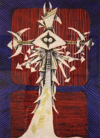 The aforementioned von Christierson collection houses one of those Cabezas de Elegguá, circa 1949 (see image no. 9), a colourful figure with an angry grimace on its face. It is a tempera painting on a medium-sized cardboard (76.2 x 54.6) that portrays the rhomboid-shaped head of an imaginary figure (that, due to his bearing, could be considered Elegguá as evidenced by studies made by the artist); the figure’s face has small close-knit eyes and is situated at the centre of a cruciate axis and at the top of an elongated neck, covered with arrows that point in all directions, as it is characteristic of the orichá “owner” of roads and paths. The arms of the cross are crowned with criss-crossed crescents, a somewhat strange form to add to this orichá’s portrayal, but one that appears in almost all of the known Cabezas de Elegguá and in other pieces where this orichá is represented, like in Elegguá regala los caminos (see image no. 7 and no. 8).